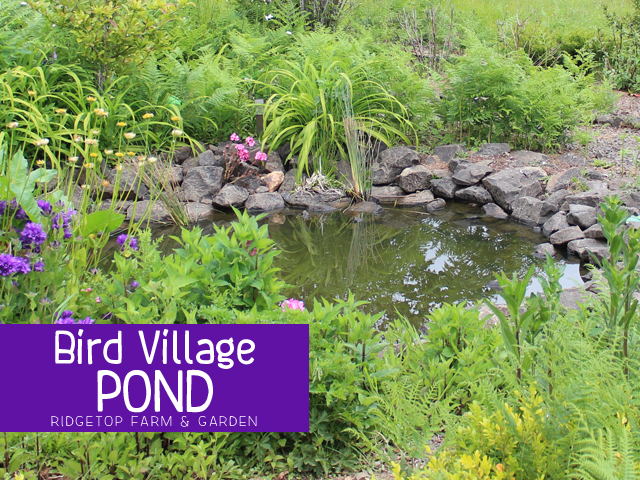 All the rain water from our gutters drain right about where the left back edge of the main pond begins. In the beginning days of the bird village, we tried turning the area into a bog garden. We didn’t do it correctly & so it wasn’t very boggy most of the year. What we did learn from that experience, though, is that excess water drains right out over the path, making a mess of it. So, we built a drainage area for this pond and then added a smaller pool to collect the water. The drainage area does go right through our walking path, though. Eventually, Farmer John is going to build a cutesy little bridge to go over that area.